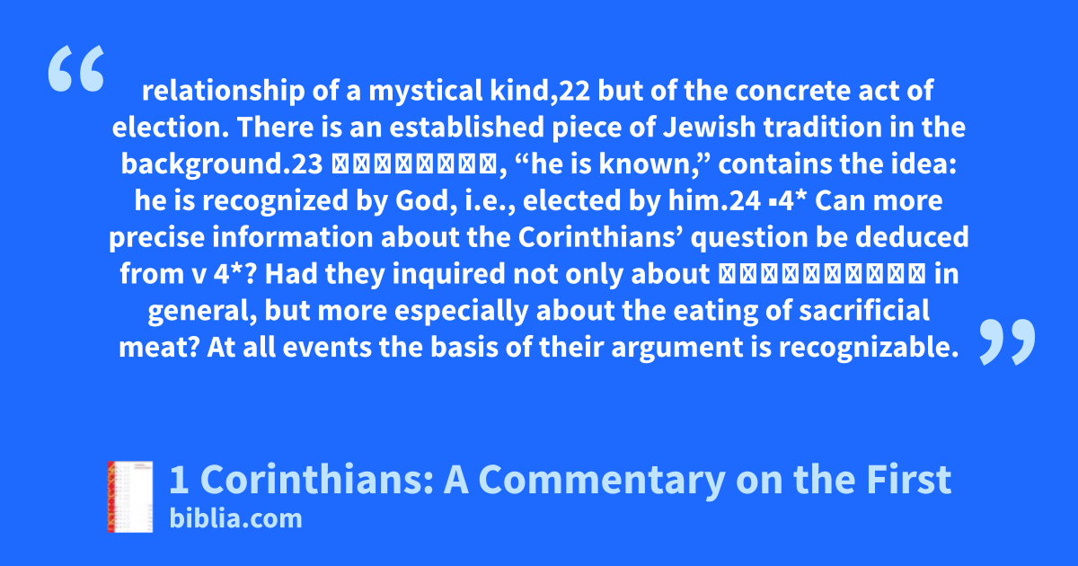 relationship of a mystical kind,22 but of the concrete act of election. There is an established piece of Jewish tradition in the background.23 ἔγνωσται, “he is known,” contains the idea: he is recognized by God, i.e., elected by him.24 ■4* Can more precise information about the Corinthians’ question be deduced from v 4*? Had they inquired not only about εἰδωλόθυτα in general, but more especially about the eating of sacrificial meat? At all events the basis of their argument is recognizable.
