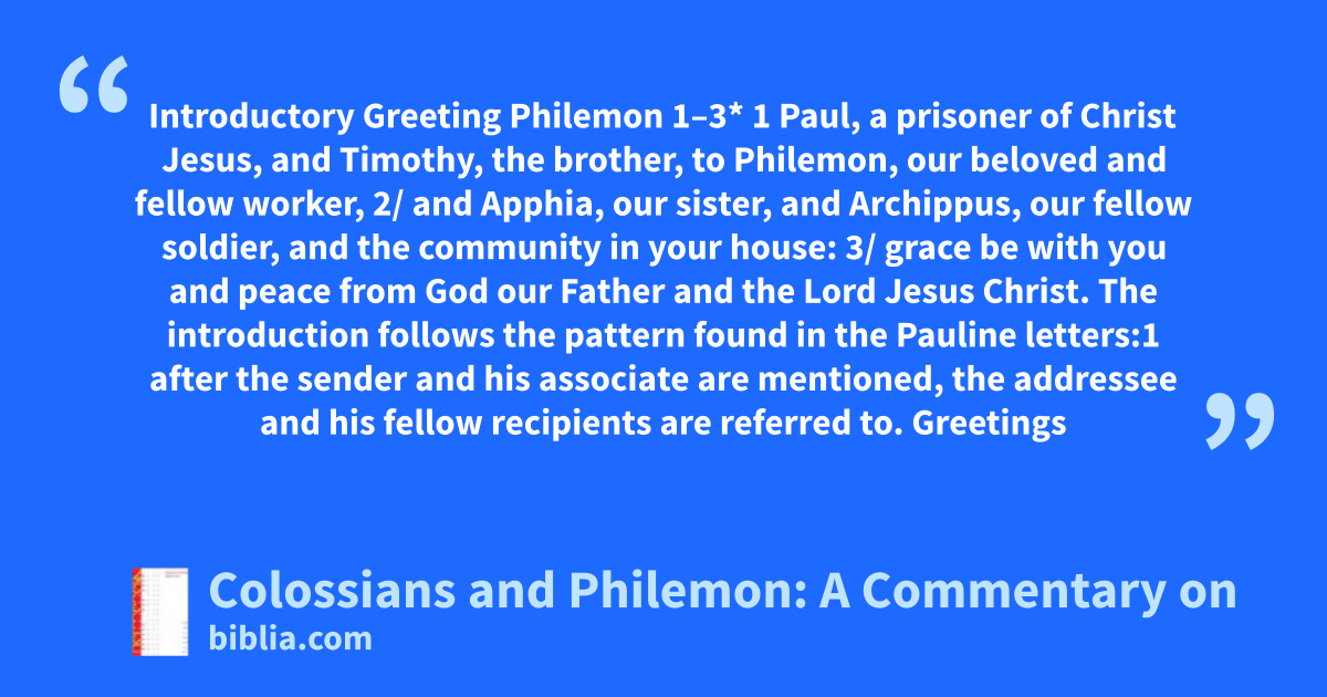 Introductory Greeting Philemon 1–3* 1 Paul, a prisoner of Christ Jesus, and Timothy, the brother, to Philemon, our beloved and fellow worker, 2/ and Apphia, our sister, and Archippus, our fellow soldier, and the community in your house: 3/ grace be with you and peace from God our Father and the Lord Jesus Christ. The introduction follows the pattern found in the Pauline letters:1 after the sender and his associate are mentioned, the addressee and his fellow recipients are referred to. Greetings
