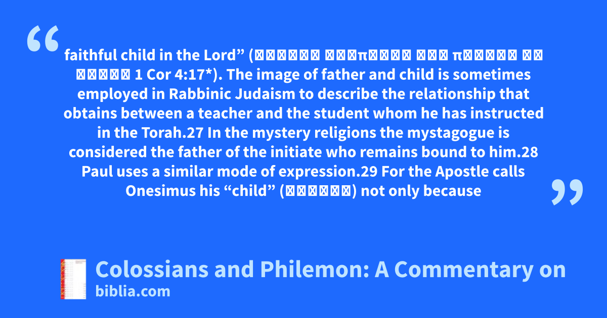 faithful child in the Lord” (τέκνον ἀγαπητὸν καὶ πιστὸν ἐν κυρίῳ 1 Cor 4:17*). The image of father and child is sometimes employed in Rabbinic Judaism to describe the relationship that obtains between a teacher and the student whom he has instructed in the Torah.27 In the mystery religions the mystagogue is considered the father of the initiate who remains bound to him.28 Paul uses a similar mode of expression.29 For the Apostle calls Onesimus his “child” (τέκνον) not only because