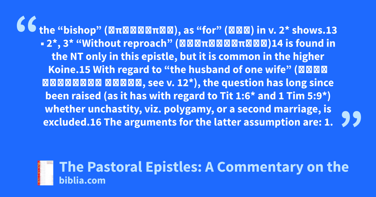 the “bishop” (ἐπίσκοπος), as “for” (οὖν) in v. 2* shows.13 ■ 2*, 3* “Without reproach” (ἀνεπίλημπτος)14 is found in the NT only in this epistle, but it is common in the higher Koine.15 With regard to “the husband of one wife” (μιᾶς γυναικὸς ἄνδρα, see v. 12*), the question has long since been raised (as it has with regard to Tit 1:6* and 1 Tim 5:9*) whether unchastity, viz. polygamy, or a second marriage, is excluded.16 The arguments for the latter assumption are: 1.