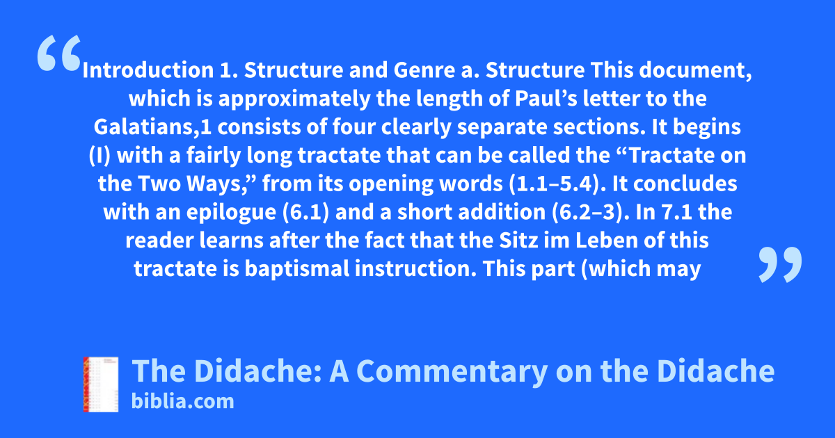 Introduction 1. Structure and Genre a. Structure This document, which is approximately the length of Paul’s letter to the Galatians,1 consists of four clearly separate sections. It begins (I) with a fairly long tractate that can be called the “Tractate on the Two Ways,” from its opening words (1.1–5.4). It concludes with an epilogue (6.1) and a short addition (6.2–3). In 7.1 the reader learns after the fact that the Sitz im Leben of this tractate is baptismal instruction. This part (which may