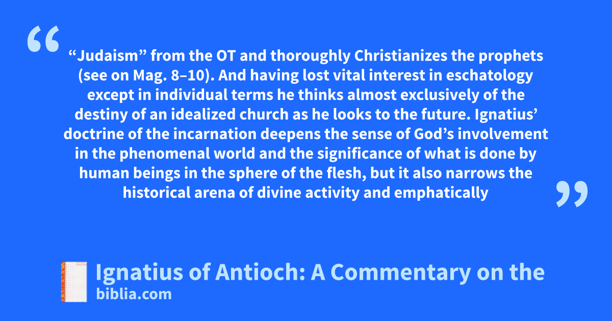 “Judaism” from the OT and thoroughly Christianizes the prophets (see on Mag. 8–10). And having lost vital interest in eschatology except in individual terms he thinks almost exclusively of the destiny of an idealized church as he looks to the future. Ignatius’ doctrine of the incarnation deepens the sense of God’s involvement in the phenomenal world and the significance of what is done by human beings in the sphere of the flesh, but it also narrows the historical arena of divine activity and emphatically