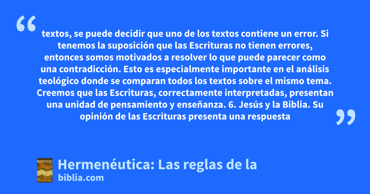 textos, se puede decidir que uno de los textos contiene un error. Si tenemos la suposición que las Escrituras no tienen errores, entonces somos motivados a resolver lo que puede parecer como una contradicción. Esto es especialmente importante en el análisis teológico donde se comparan todos los textos sobre el mismo tema. Creemos que las Escrituras, correctamente interpretadas, presentan una unidad de pensamiento y enseñanza. 6. Jesús y la Biblia. Su opinión de las Escrituras presenta una respuesta