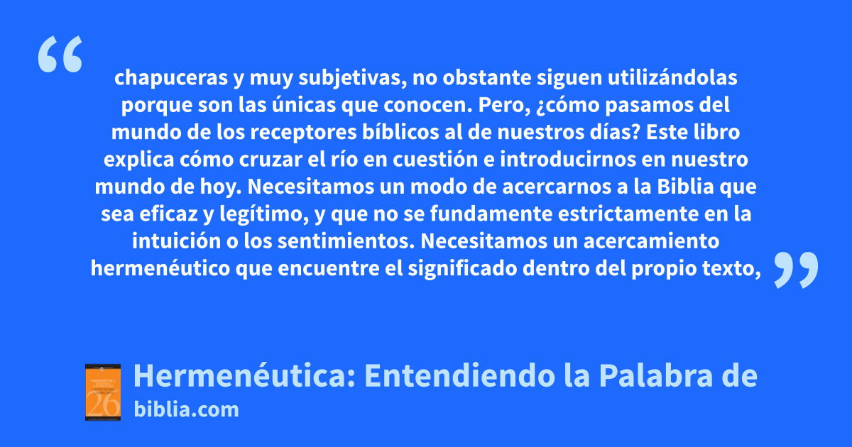 chapuceras y muy subjetivas, no obstante siguen utilizándolas porque son las únicas que conocen. Pero, ¿cómo pasamos del mundo de los receptores bíblicos al de nuestros días? Este libro explica cómo cruzar el río en cuestión e introducirnos en nuestro mundo de hoy. Necesitamos un modo de acercarnos a la Biblia que sea eficaz y legítimo, y que no se fundamente estrictamente en la intuición o los sentimientos. Necesitamos un acercamiento hermenéutico que encuentre el significado dentro del propio texto,