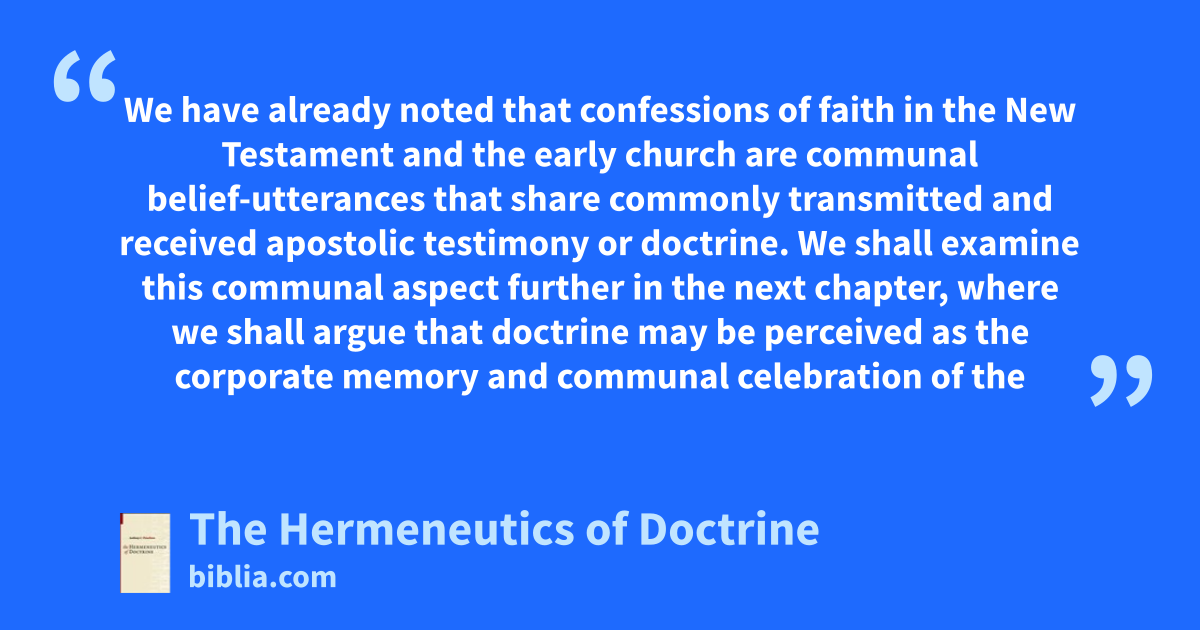 We have already noted that confessions of faith in the New Testament and the early church are communal belief-utterances that share commonly transmitted and received apostolic testimony or doctrine. We shall examine this communal aspect further in the next chapter, where we shall argue that doctrine may be perceived as the corporate memory and communal celebration of the