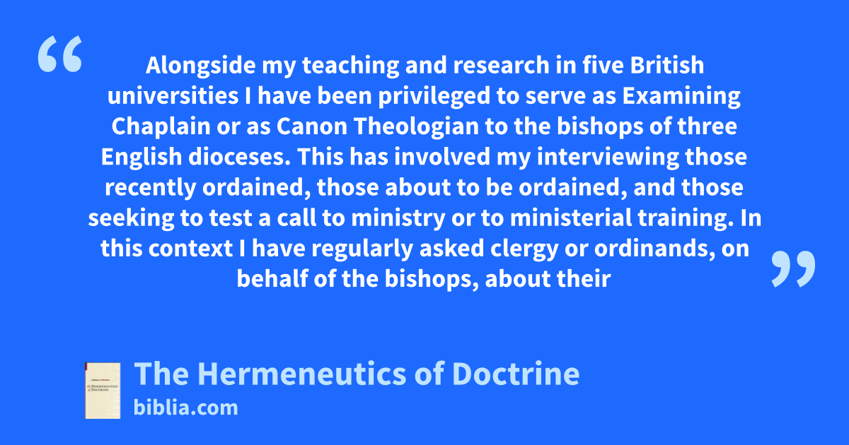 Alongside my teaching and research in five British universities I have been privileged to serve as Examining Chaplain or as Canon Theologian to the bishops of three English dioceses. This has involved my interviewing those recently ordained, those about to be ordained, and those seeking to test a call to ministry or to ministerial training. In this context I have regularly asked clergy or ordinands, on behalf of the bishops, about their