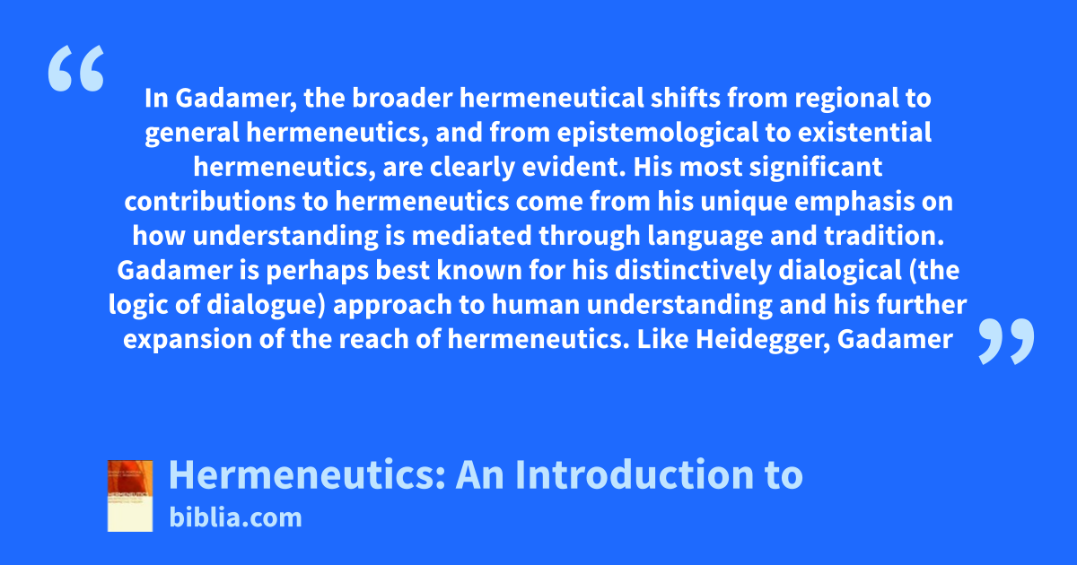 In Gadamer, the broader hermeneutical shifts from regional to general hermeneutics, and from epistemological to existential hermeneutics, are clearly evident. His most significant contributions to hermeneutics come from his unique emphasis on how understanding is mediated through language and tradition. Gadamer is perhaps best known for his distinctively dialogical (the logic of dialogue) approach to human understanding and his further expansion of the reach of hermeneutics. Like Heidegger, Gadamer