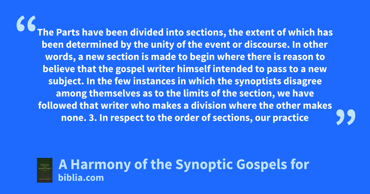 The Parts have been divided into sections, the extent of which has been determined by the unity of the event or discourse. In other words, a new section is made to begin where there is reason to believe that the gospel writer himself intended to pass to a new subject. In the few instances in which the synoptists disagree among themselves as to the limits of the section, we have followed that writer who makes a division where the other makes none. 3. In respect to the order of sections, our practice