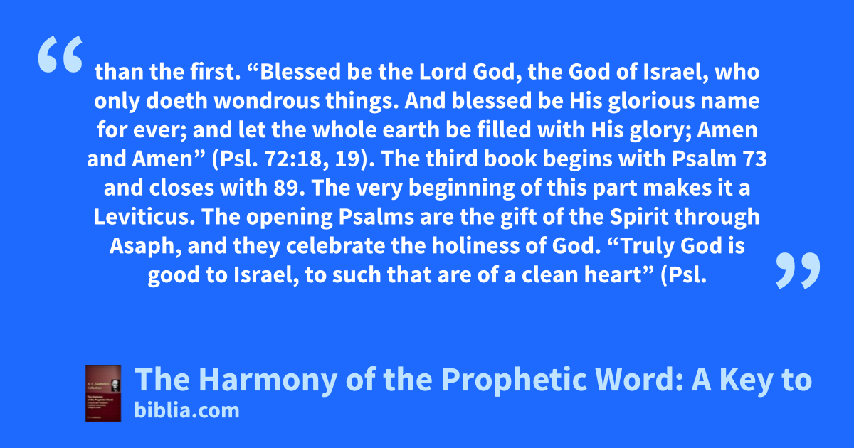 than the first. “Blessed be the Lord God, the God of Israel, who only doeth wondrous things. And blessed be His glorious name for ever; and let the whole earth be filled with His glory; Amen and Amen” (Psl. 72:18, 19). The third book begins with Psalm 73 and closes with 89. The very beginning of this part makes it a Leviticus. The opening Psalms are the gift of the Spirit through Asaph, and they celebrate the holiness of God. “Truly God is good to Israel, to such that are of a clean heart” (Psl.