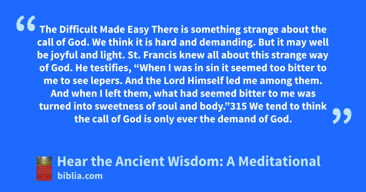 The Difficult Made Easy There is something strange about the call of God. We think it is hard and demanding. But it may well be joyful and light. St. Francis knew all about this strange way of God. He testifies, “When I was in sin it seemed too bitter to me to see lepers. And the Lord Himself led me among them. And when I left them, what had seemed bitter to me was turned into sweetness of soul and body.”315 We tend to think the call of God is only ever the demand of God.