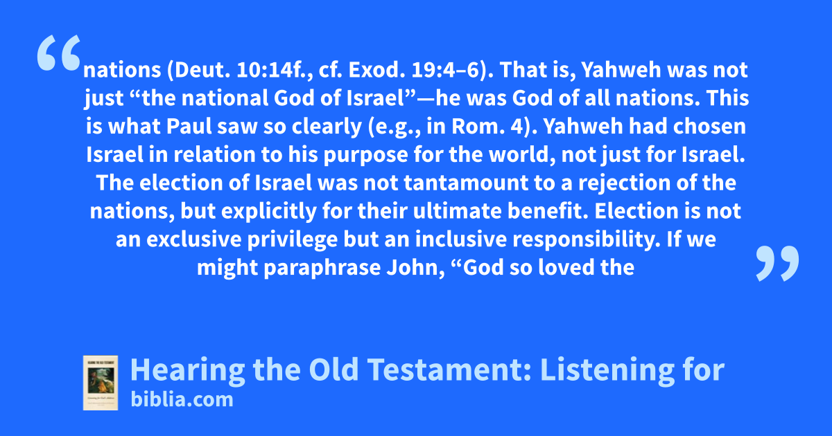nations (Deut. 10:14f., cf. Exod. 19:4–6). That is, Yahweh was not just “the national God of Israel”—he was God of all nations. This is what Paul saw so clearly (e.g., in Rom. 4). Yahweh had chosen Israel in relation to his purpose for the world, not just for Israel. The election of Israel was not tantamount to a rejection of the nations, but explicitly for their ultimate benefit. Election is not an exclusive privilege but an inclusive responsibility. If we might paraphrase John, “God so loved the