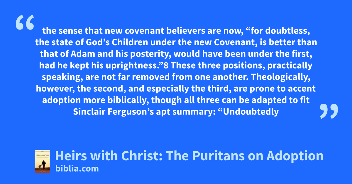 the sense that new covenant believers are now, “for doubtless, the state of God’s Children under the new Covenant, is better than that of Adam and his posterity, would have been under the first, had he kept his uprightness.”8 These three positions, practically speaking, are not far removed from one another. Theologically, however, the second, and especially the third, are prone to accent adoption more biblically, though all three can be adapted to fit Sinclair Ferguson’s apt summary: “Undoubtedly