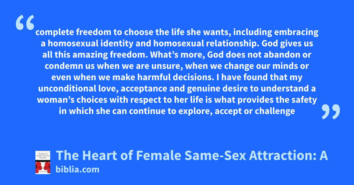 complete freedom to choose the life she wants, including embracing a homosexual identity and homosexual relationship. God gives us all this amazing freedom. What’s more, God does not abandon or condemn us when we are unsure, when we change our minds or even when we make harmful decisions. I have found that my unconditional love, acceptance and genuine desire to understand a woman’s choices with respect to her life is what provides the safety in which she can continue to explore, accept or challenge