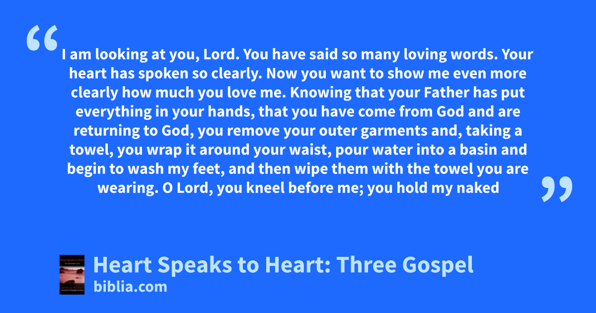 I am looking at you, Lord. You have said so many loving words. Your heart has spoken so clearly. Now you want to show me even more clearly how much you love me. Knowing that your Father has put everything in your hands, that you have come from God and are returning to God, you remove your outer garments and, taking a towel, you wrap it around your waist, pour water into a basin and begin to wash my feet, and then wipe them with the towel you are wearing. O Lord, you kneel before me; you hold my naked