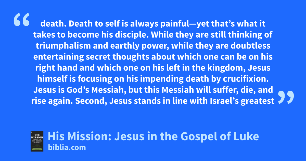 death. Death to self is always painful—yet that’s what it takes to become his disciple. While they are still thinking of triumphalism and earthly power, while they are doubtless entertaining secret thoughts about which one can be on his right hand and which one on his left in the kingdom, Jesus himself is focusing on his impending death by crucifixion. Jesus is God’s Messiah, but this Messiah will suffer, die, and rise again. Second, Jesus stands in line with Israel’s greatest