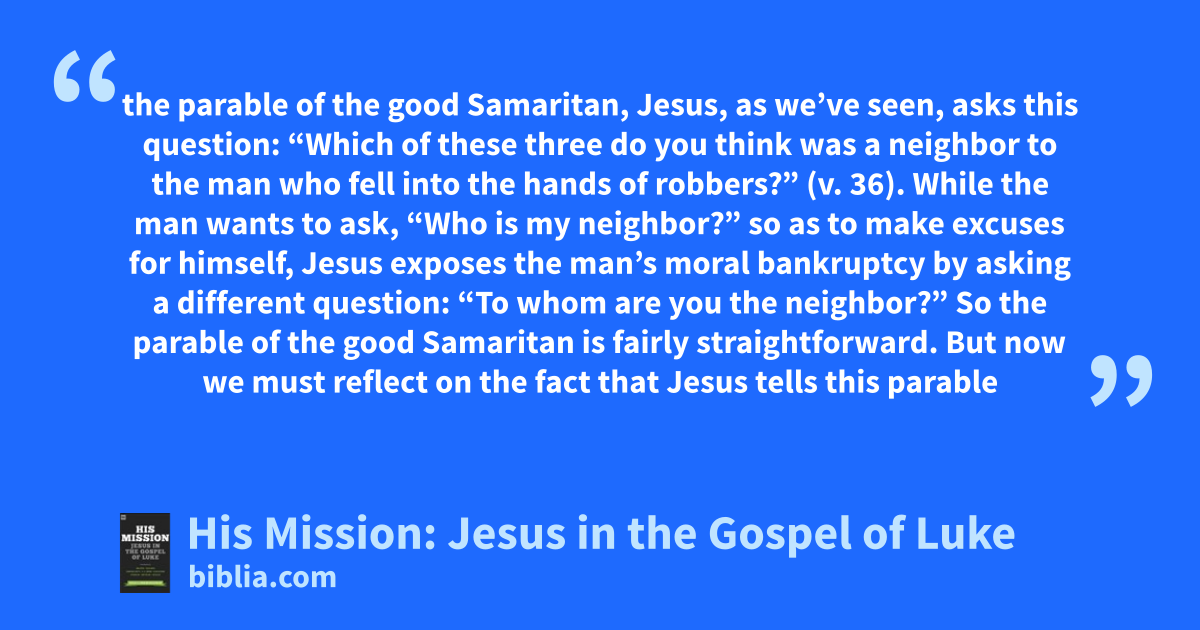 the parable of the good Samaritan, Jesus, as we’ve seen, asks this question: “Which of these three do you think was a neighbor to the man who fell into the hands of robbers?” (v. 36). While the man wants to ask, “Who is my neighbor?” so as to make excuses for himself, Jesus exposes the man’s moral bankruptcy by asking a different question: “To whom are you the neighbor?” So the parable of the good Samaritan is fairly straightforward. But now we must reflect on the fact that Jesus tells this parable