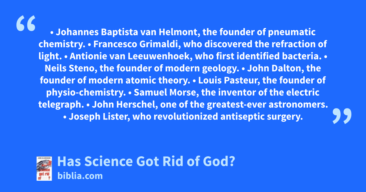 • Johannes Baptista van Helmont, the founder of pneumatic chemistry. • Francesco Grimaldi, who discovered the refraction of light. • Antionie van Leeuwenhoek, who first identified bacteria. • Neils Steno, the founder of modern geology. • John Dalton, the founder of modern atomic theory. • Louis Pasteur, the founder of physio-chemistry. • Samuel Morse, the inventor of the electric telegraph. • John Herschel, one of the greatest-ever astronomers. • Joseph Lister, who revolutionized antiseptic surgery.