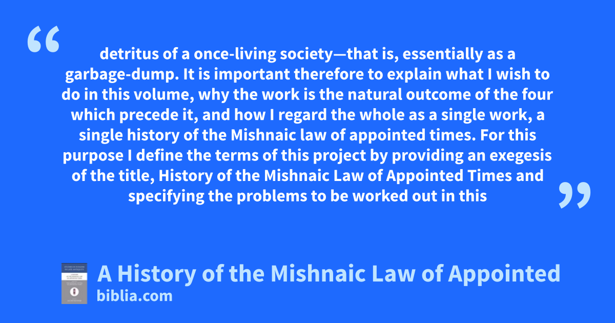 detritus of a once-living society—that is, essentially as a garbage-dump. It is important therefore to explain what I wish to do in this volume, why the work is the natural outcome of the four which precede it, and how I regard the whole as a single work, a single history of the Mishnaic law of appointed times. For this purpose I define the terms of this project by providing an exegesis of the title, History of the Mishnaic Law of Appointed Times and specifying the problems to be worked out in this
