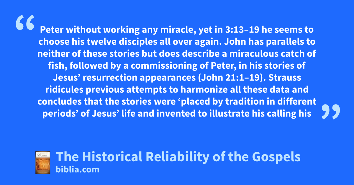 Peter without working any miracle, yet in 3:13–19 he seems to choose his twelve disciples all over again. John has parallels to neither of these stories but does describe a miraculous catch of fish, followed by a commissioning of Peter, in his stories of Jesus’ resurrection appearances (John 21:1–19). Strauss ridicules previous attempts to harmonize all these data and concludes that the stories were ‘placed by tradition in different periods’ of Jesus’ life and invented to illustrate his calling his