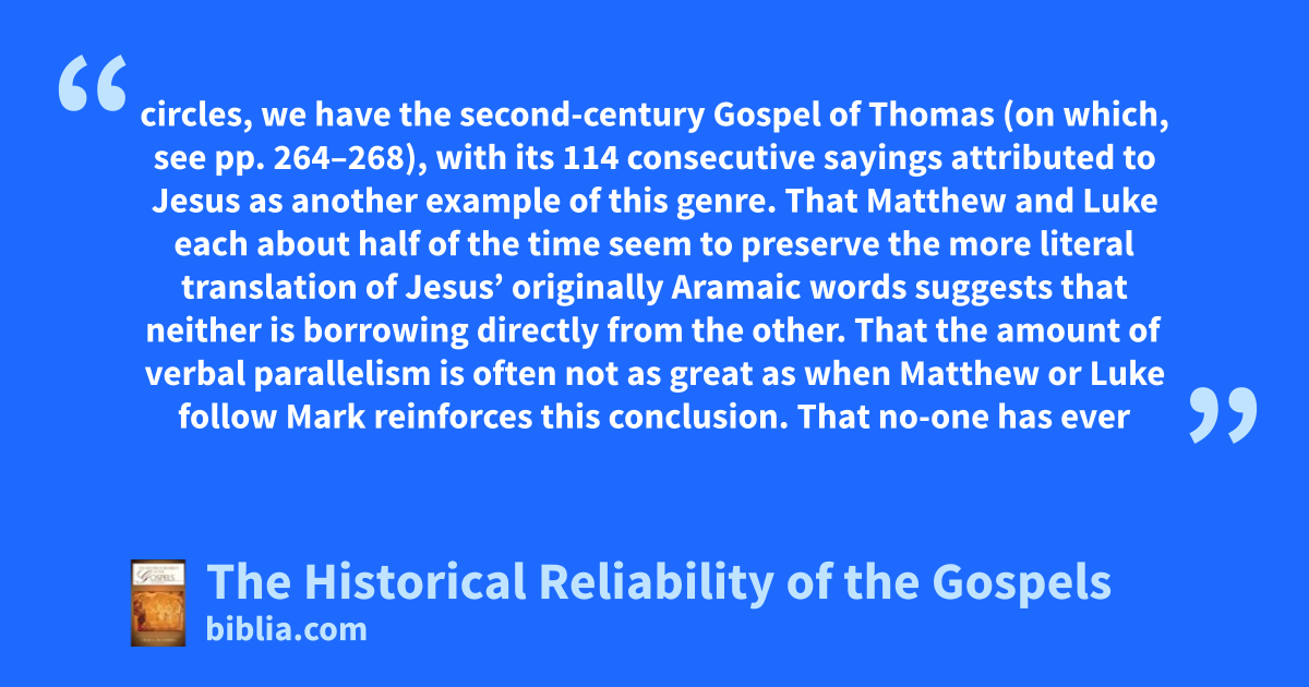 circles, we have the second-century Gospel of Thomas (on which, see pp. 264–268), with its 114 consecutive sayings attributed to Jesus as another example of this genre. That Matthew and Luke each about half of the time seem to preserve the more literal translation of Jesus’ originally Aramaic words suggests that neither is borrowing directly from the other. That the amount of verbal parallelism is often not as great as when Matthew or Luke follow Mark reinforces this conclusion. That no-one has ever