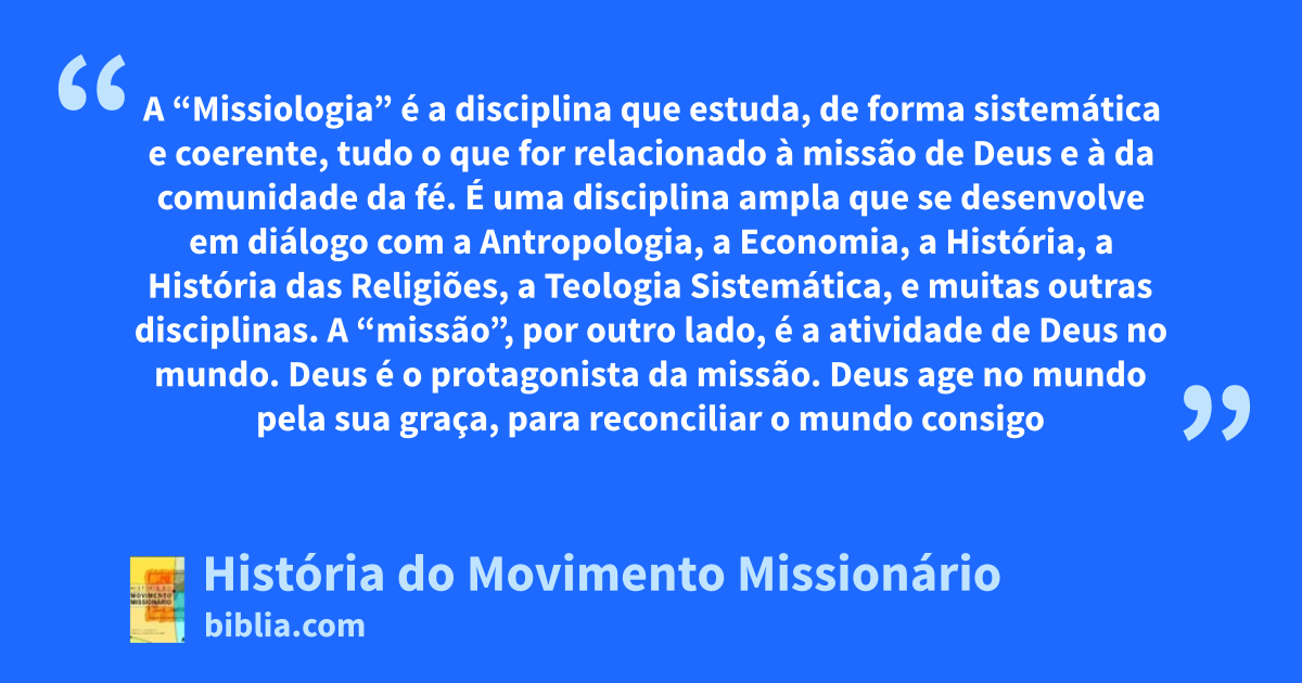 A “Missiologia” é a disciplina que estuda, de forma sistemática e coerente, tudo o que for relacionado à missão de Deus e à da comunidade da fé. É uma disciplina ampla que se desenvolve em diálogo com a Antropologia, a Economia, a História, a História das Religiões, a Teologia Sistemática, e muitas outras disciplinas. A “missão”, por outro lado, é a atividade de Deus no mundo. Deus é o protagonista da missão. Deus age no mundo pela sua graça, para reconciliar o mundo consigo