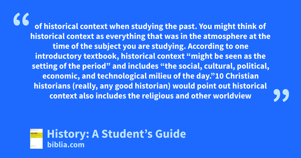 of historical context when studying the past. You might think of historical context as everything that was in the atmosphere at the time of the subject you are studying. According to one introductory textbook, historical context “might be seen as the setting of the period” and includes “the social, cultural, political, economic, and technological milieu of the day.”10 Christian historians (really, any good historian) would point out historical context also includes the religious and other worldview