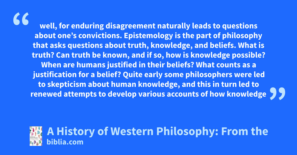 well, for enduring disagreement naturally leads to questions about one’s convictions. Epistemology is the part of philosophy that asks questions about truth, knowledge, and beliefs. What is truth? Can truth be known, and if so, how is knowledge possible? When are humans justified in their beliefs? What counts as a justification for a belief? Quite early some philosophers were led to skepticism about human knowledge, and this in turn led to renewed attempts to develop various accounts of how knowledge