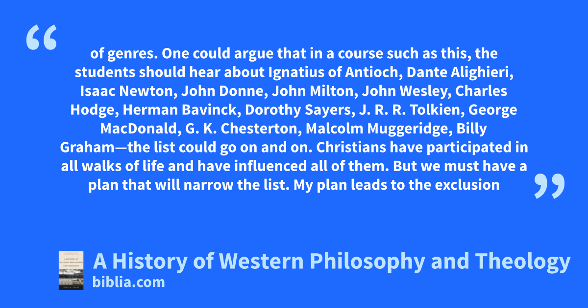of genres. One could argue that in a course such as this, the students should hear about Ignatius of Antioch, Dante Alighieri, Isaac Newton, John Donne, John Milton, John Wesley, Charles Hodge, Herman Bavinck, Dorothy Sayers, J. R. R. Tolkien, George MacDonald, G. K. Chesterton, Malcolm Muggeridge, Billy Graham—the list could go on and on. Christians have participated in all walks of life and have influenced all of them. But we must have a plan that will narrow the list. My plan leads to the exclusion