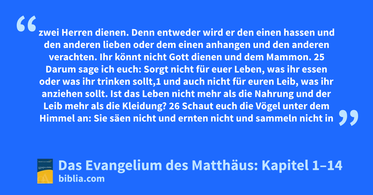 zwei Herren dienen. Denn entweder wird er den einen hassen und den anderen lieben oder dem einen anhangen und den anderen verachten. Ihr könnt nicht Gott dienen und dem Mammon. 25 Darum sage ich euch: Sorgt nicht für euer Leben, was ihr essen oder was ihr trinken sollt,1 und auch nicht für euren Leib, was ihr anziehen sollt. Ist das Leben nicht mehr als die Nahrung und der Leib mehr als die Kleidung? 26 Schaut euch die Vögel unter dem Himmel an: Sie säen nicht und ernten nicht und sammeln nicht in