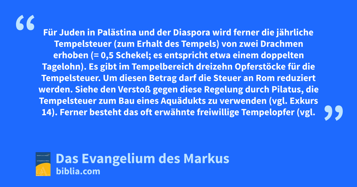 Für Juden in Palästina und der Diaspora wird ferner die jährliche Tempelsteuer (zum Erhalt des Tempels) von zwei Drachmen erhoben (= 0,5 Schekel; es entspricht etwa einem doppelten Tagelohn). Es gibt im Tempelbereich dreizehn Opferstöcke für die Tempelsteuer. Um diesen Betrag darf die Steuer an Rom reduziert werden. Siehe den Verstoß gegen diese Regelung durch Pilatus, die Tempelsteuer zum Bau eines Aquädukts zu verwenden (vgl. Exkurs 14). Ferner besteht das oft erwähnte freiwillige Tempelopfer (vgl.