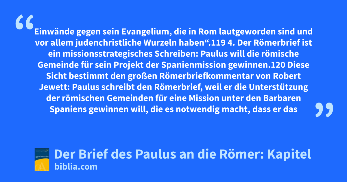 Einwände gegen sein Evangelium, die in Rom lautgeworden sind und vor allem judenchristliche Wurzeln haben“.119 4. Der Römerbrief ist ein missionsstrategisches Schreiben: Paulus will die römische Gemeinde für sein Projekt der Spanienmission gewinnen.120 Diese Sicht bestimmt den großen Römerbriefkommentar von Robert Jewett: Paulus schreibt den Römerbrief, weil er die Unterstützung der römischen Gemeinden für eine Mission unter den Barbaren Spaniens gewinnen will, die es notwendig macht, dass er das