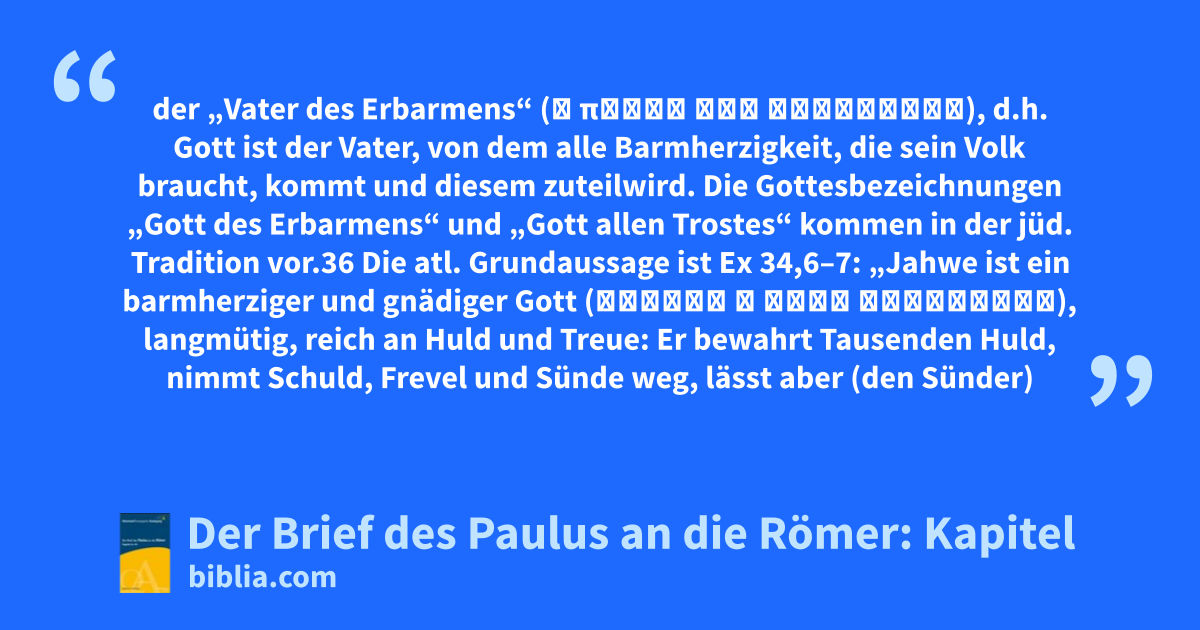 der „Vater des Erbarmens“ (ὁ πατὴρ τῶν οἰκτιρμῶν), d.h. Gott ist der Vater, von dem alle Barmherzigkeit, die sein Volk braucht, kommt und diesem zuteilwird. Die Gottesbezeichnungen „Gott des Erbarmens“ und „Gott allen Trostes“ kommen in der jüd. Tradition vor.36 Die atl. Grundaussage ist Ex 34,6–7: „Jahwe ist ein barmherziger und gnädiger Gott (Κύριος ὁ θεὸς οἰκτίρμων), langmütig, reich an Huld und Treue: Er bewahrt Tausenden Huld, nimmt Schuld, Frevel und Sünde weg, lässt aber (den Sünder)