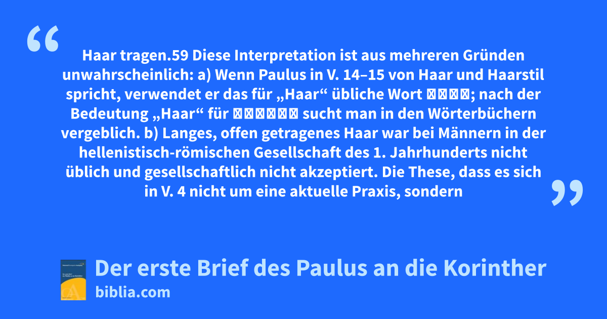 Haar tragen.59 Diese Interpretation ist aus mehreren Gründen unwahrscheinlich: a) Wenn Paulus in V. 14–15 von Haar und Haarstil spricht, verwendet er das für „Haar“ übliche Wort κομᾶ; nach der Bedeutung „Haar“ für κεφαλή sucht man in den Wörterbüchern vergeblich. b) Langes, offen getragenes Haar war bei Männern in der hellenistisch-römischen Gesellschaft des 1. Jahrhunderts nicht üblich und gesellschaftlich nicht akzeptiert. Die These, dass es sich in V. 4 nicht um eine aktuelle Praxis, sondern