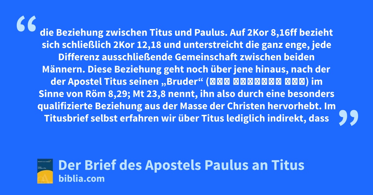 die Beziehung zwischen Titus und Paulus. Auf 2Kor 8,16ff bezieht sich schließlich 2Kor 12,18 und unterstreicht die ganz enge, jede Differenz ausschließende Gemeinschaft zwischen beiden Männern. Diese Beziehung geht noch über jene hinaus, nach der der Apostel Titus seinen „Bruder“ (τὸν ἀδελφόν μου) im Sinne von Röm 8,29; Mt 23,8 nennt, ihn also durch eine besonders qualifizierte Beziehung aus der Masse der Christen hervorhebt. Im Titusbrief selbst erfahren wir über Titus lediglich indirekt, dass
