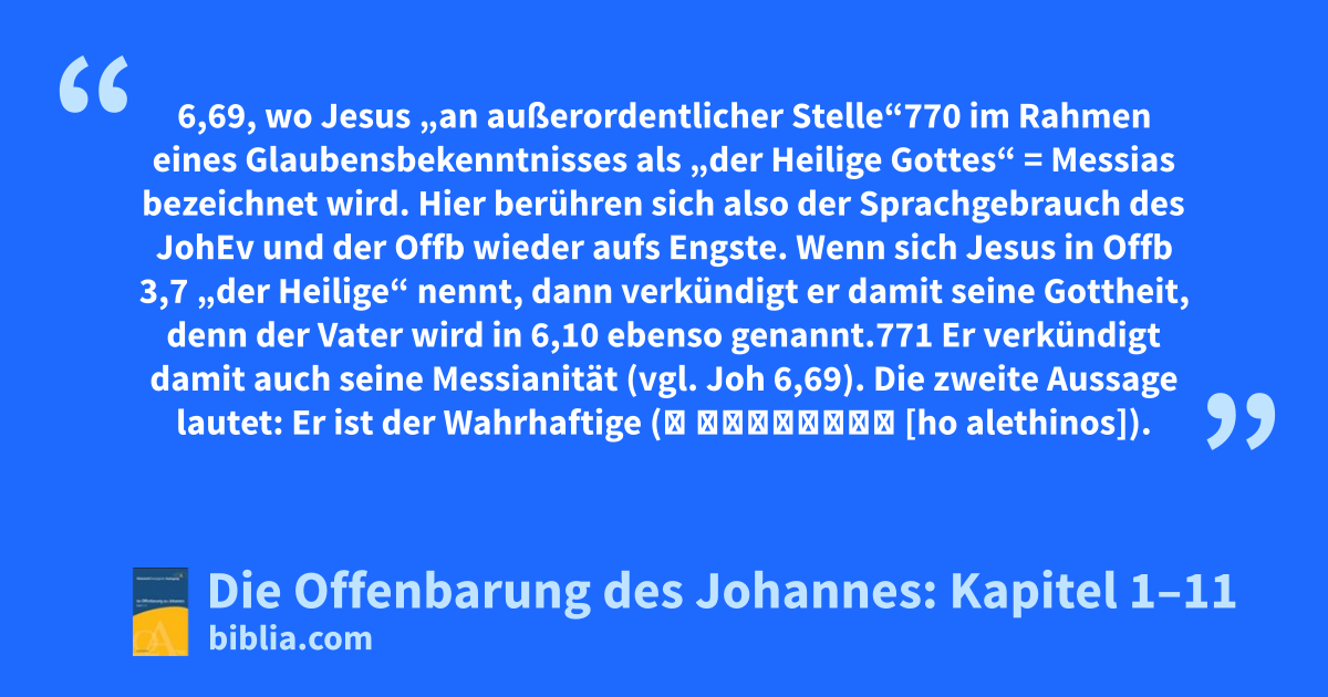 6,69, wo Jesus „an außerordentlicher Stelle“770 im Rahmen eines Glaubensbekenntnisses als „der Heilige Gottes“ = Messias bezeichnet wird. Hier berühren sich also der Sprachgebrauch des JohEv und der Offb wieder aufs Engste. Wenn sich Jesus in Offb 3,7 „der Heilige“ nennt, dann verkündigt er damit seine Gottheit, denn der Vater wird in 6,10 ebenso genannt.771 Er verkündigt damit auch seine Messianität (vgl. Joh 6,69). Die zweite Aussage lautet: Er ist der Wahrhaftige (ὁ ἀληθινός [ho alethinos]).