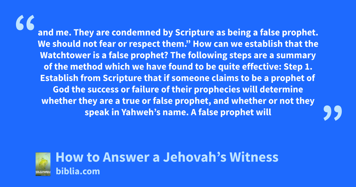 and me. They are condemned by Scripture as being a false prophet. We should not fear or respect them.” How can we establish that the Watchtower is a false prophet? The following steps are a summary of the method which we have found to be quite effective: Step 1. Establish from Scripture that if someone claims to be a prophet of God the success or failure of their prophecies will determine whether they are a true or false prophet, and whether or not they speak in Yahweh’s name. A false prophet will