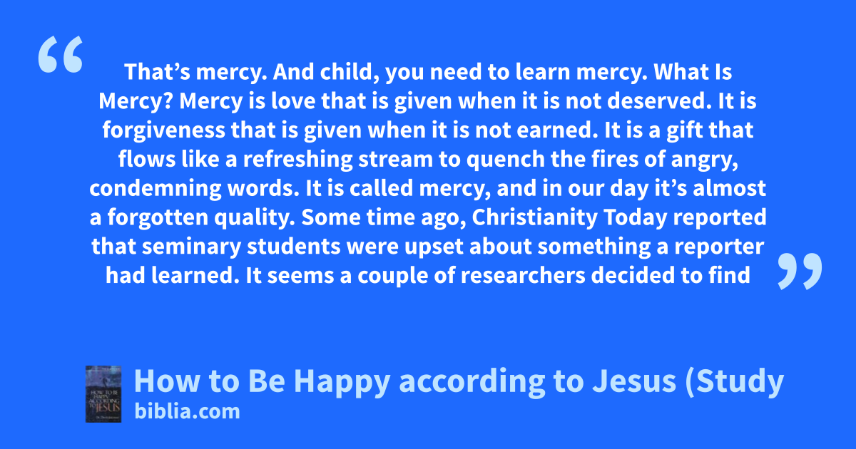That’s mercy. And child, you need to learn mercy. What Is Mercy? Mercy is love that is given when it is not deserved. It is forgiveness that is given when it is not earned. It is a gift that flows like a refreshing stream to quench the fires of angry, condemning words. It is called mercy, and in our day it’s almost a forgotten quality. Some time ago, Christianity Today reported that seminary students were upset about something a reporter had learned. It seems a couple of researchers decided to find
