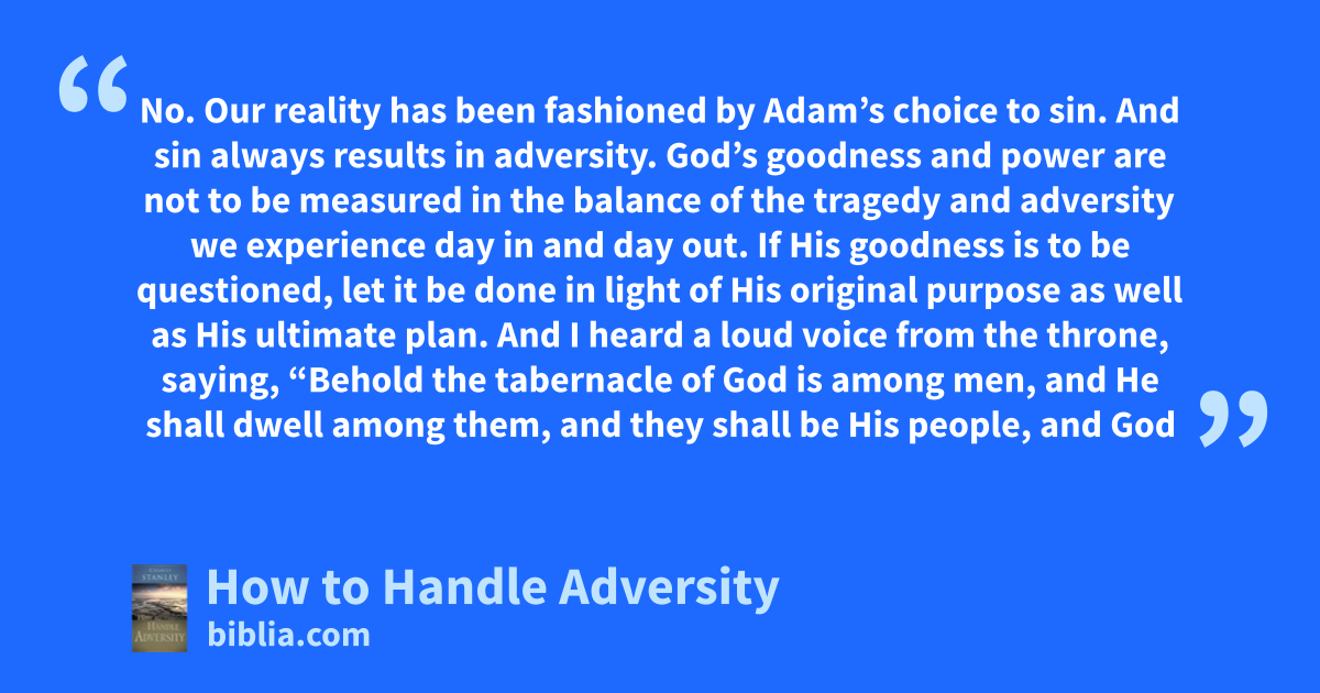 No. Our reality has been fashioned by Adam’s choice to sin. And sin always results in adversity. God’s goodness and power are not to be measured in the balance of the tragedy and adversity we experience day in and day out. If His goodness is to be questioned, let it be done in light of His original purpose as well as His ultimate plan. And I heard a loud voice from the throne, saying, “Behold the tabernacle of God is among men, and He shall dwell among them, and they shall be His people, and God