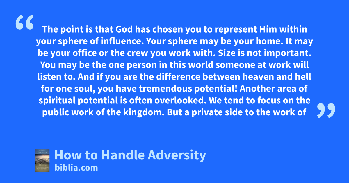 The point is that God has chosen you to represent Him within your sphere of influence. Your sphere may be your home. It may be your office or the crew you work with. Size is not important. You may be the one person in this world someone at work will listen to. And if you are the difference between heaven and hell for one soul, you have tremendous potential! Another area of spiritual potential is often overlooked. We tend to focus on the public work of the kingdom. But a private side to the work of
