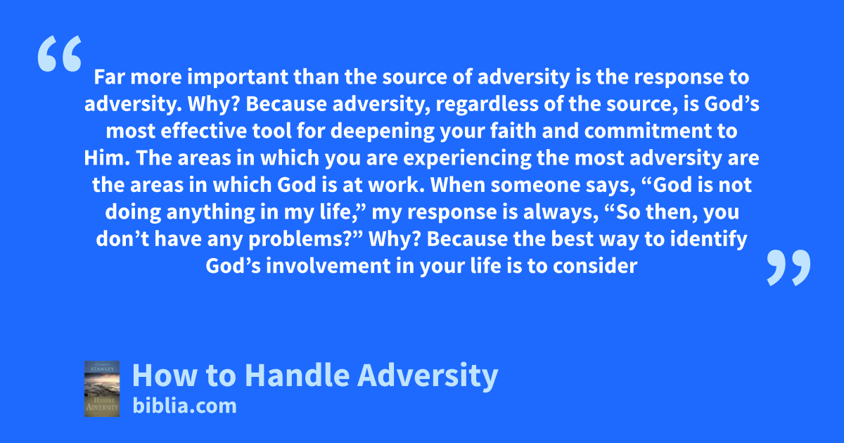 Far more important than the source of adversity is the response to adversity. Why? Because adversity, regardless of the source, is God’s most effective tool for deepening your faith and commitment to Him. The areas in which you are experiencing the most adversity are the areas in which God is at work. When someone says, “God is not doing anything in my life,” my response is always, “So then, you don’t have any problems?” Why? Because the best way to identify God’s involvement in your life is to consider