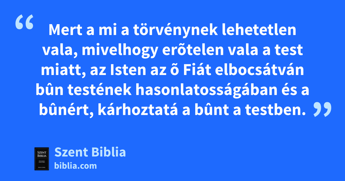 3 Mert a mi a törvénynek lehetetlen vala, mivelhogy erõtelen vala a test miatt, az Isten az õ Fiát elbocsátván bûn testének hasonlatosságában és a bûnért, kárhoztatá a bûnt a testben.
