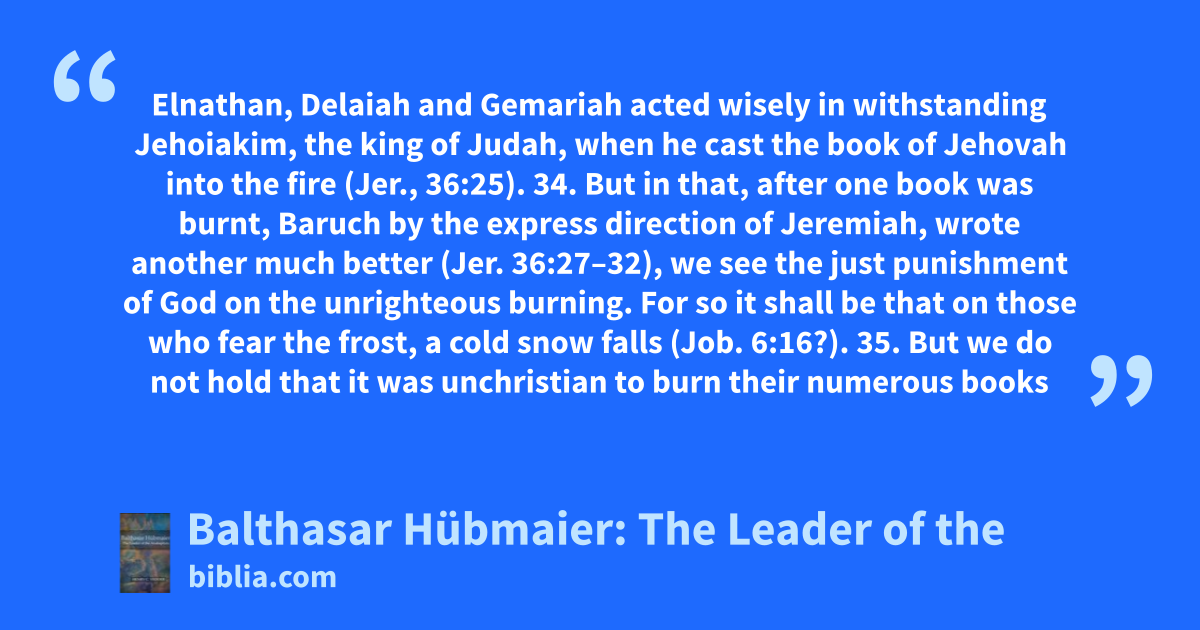 Elnathan, Delaiah and Gemariah acted wisely in withstanding Jehoiakim, the king of Judah, when he cast the book of Jehovah into the fire (Jer., 36:25). 34. But in that, after one book was burnt, Baruch by the express direction of Jeremiah, wrote another much better (Jer. 36:27–32), we see the just punishment of God on the unrighteous burning. For so it shall be that on those who fear the frost, a cold snow falls (Job. 6:16?). 35. But we do not hold that it was unchristian to burn their numerous books