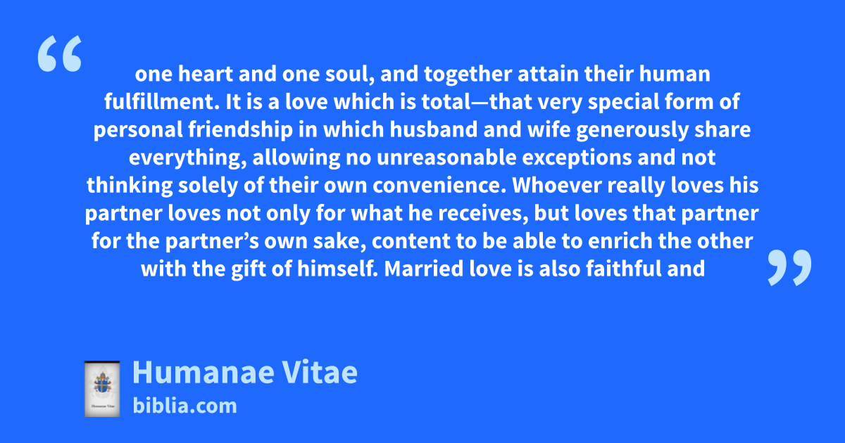 Pope Paul VI’s 1968 encyclical Humanae Vitae addresses marriage, sexuality and the regulation of births. It reiterates Catholic teaching on the procreative and unitive purposes of marital relations and, based on this, reaffirms traditional Catholic teaching against contraception.