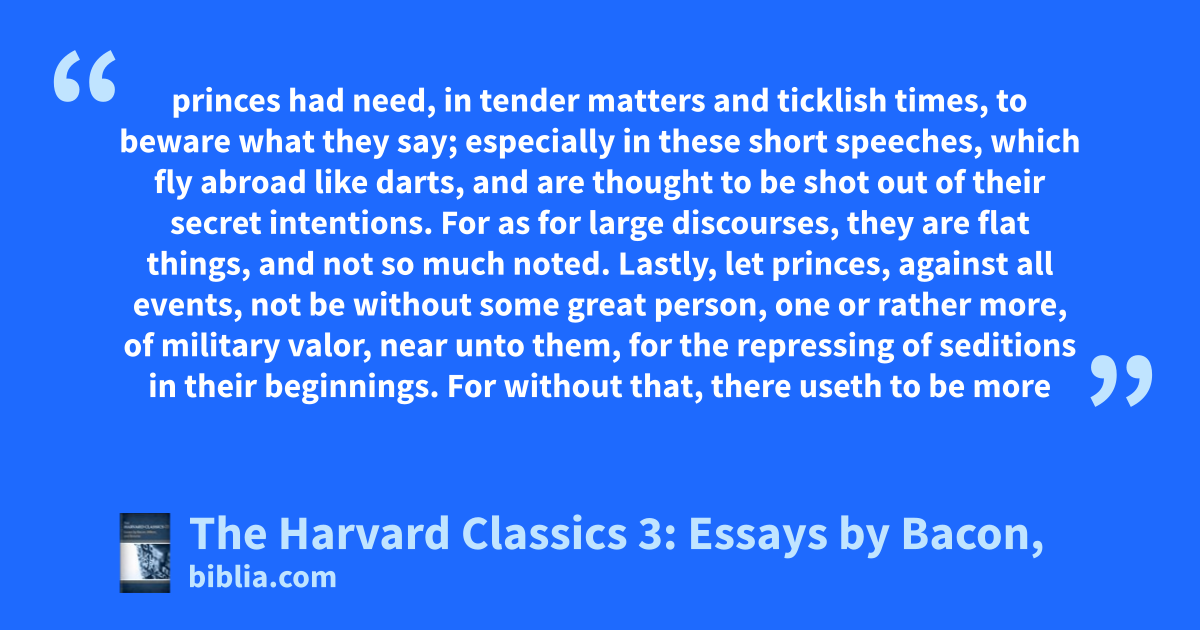 princes had need, in tender matters and ticklish times, to beware what they say; especially in these short speeches, which fly abroad like darts, and are thought to be shot out of their secret intentions. For as for large discourses, they are flat things, and not so much noted. Lastly, let princes, against all events, not be without some great person, one or rather more, of military valor, near unto them, for the repressing of seditions in their beginnings. For without that, there useth to be more