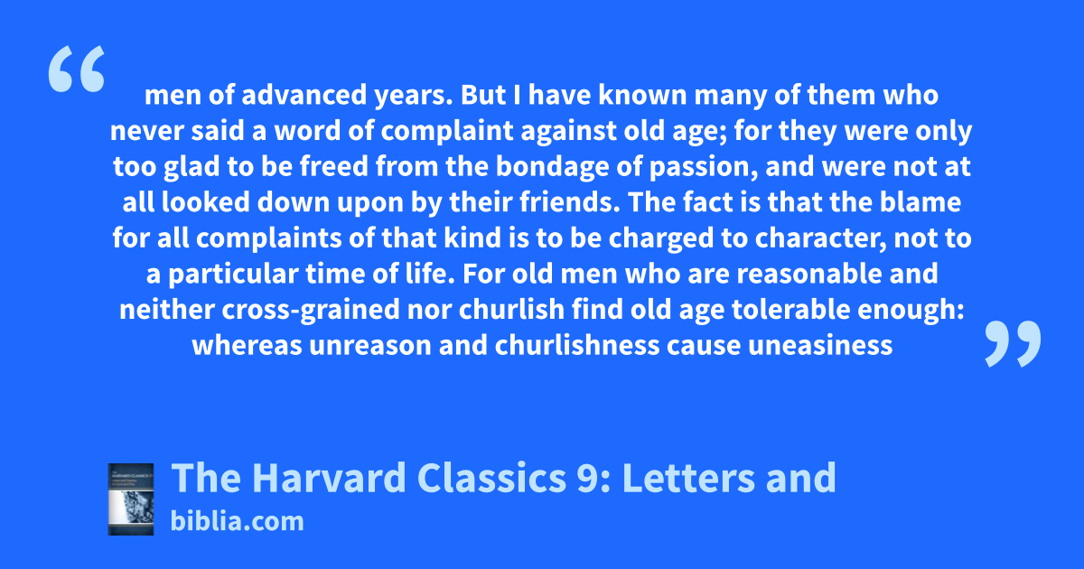 men of advanced years. But I have known many of them who never said a word of complaint against old age; for they were only too glad to be freed from the bondage of passion, and were not at all looked down upon by their friends. The fact is that the blame for all complaints of that kind is to be charged to character, not to a particular time of life. For old men who are reasonable and neither cross-grained nor churlish find old age tolerable enough: whereas unreason and churlishness cause uneasiness