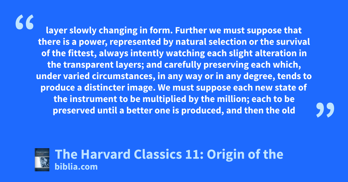 layer slowly changing in form. Further we must suppose that there is a power, represented by natural selection or the survival of the fittest, always intently watching each slight alteration in the transparent layers; and carefully preserving each which, under varied circumstances, in any way or in any degree, tends to produce a distincter image. We must suppose each new state of the instrument to be multiplied by the million; each to be preserved until a better one is produced, and then the old