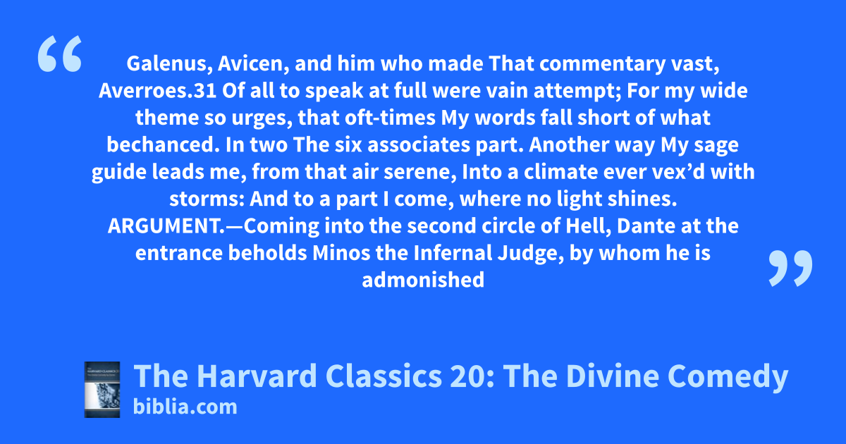 Galenus, Avicen, and him who made That commentary vast, Averroes.31 Of all to speak at full were vain attempt; For my wide theme so urges, that oft-times My words fall short of what bechanced. In two The six associates part. Another way My sage guide leads me, from that air serene, Into a climate ever vex’d with storms: And to a part I come, where no light shines. ARGUMENT.—Coming into the second circle of Hell, Dante at the entrance beholds Minos the Infernal Judge, by whom he is admonished