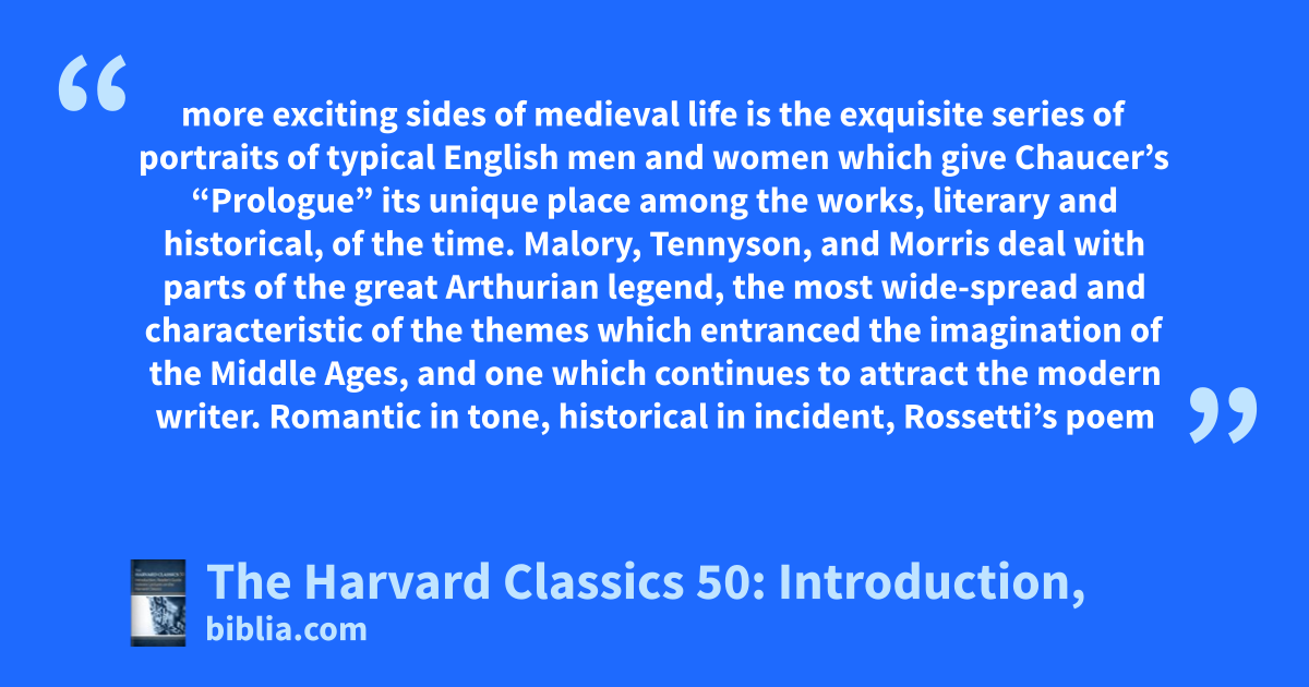 more exciting sides of medieval life is the exquisite series of portraits of typical English men and women which give Chaucer’s “Prologue” its unique place among the works, literary and historical, of the time. Malory, Tennyson, and Morris deal with parts of the great Arthurian legend, the most wide-spread and characteristic of the themes which entranced the imagination of the Middle Ages, and one which continues to attract the modern writer. Romantic in tone, historical in incident, Rossetti’s poem