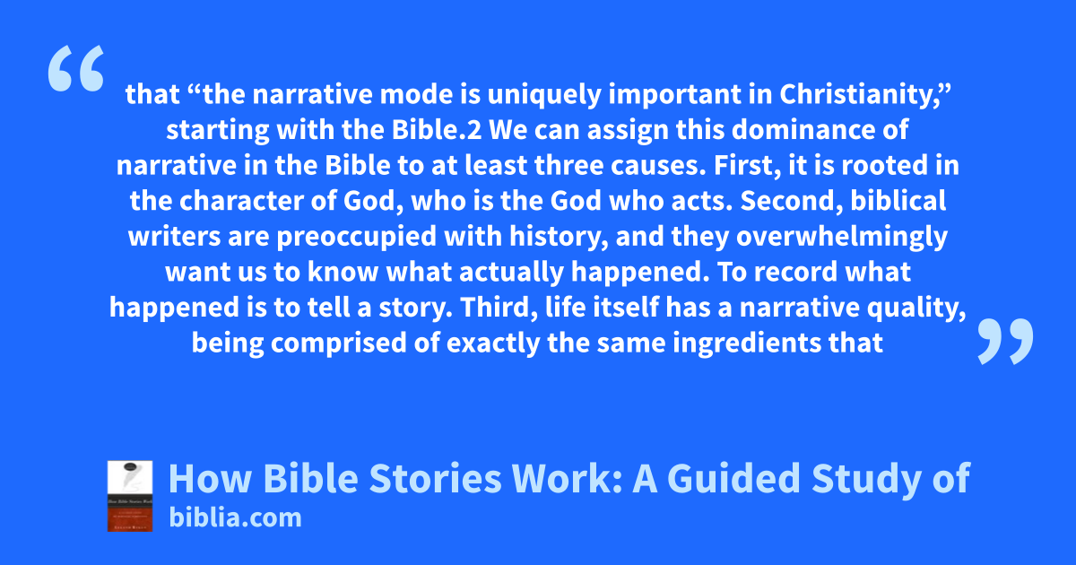 that “the narrative mode is uniquely important in Christianity,” starting with the Bible.2 We can assign this dominance of narrative in the Bible to at least three causes. First, it is rooted in the character of God, who is the God who acts. Second, biblical writers are preoccupied with history, and they overwhelmingly want us to know what actually happened. To record what happened is to tell a story. Third, life itself has a narrative quality, being comprised of exactly the same ingredients that