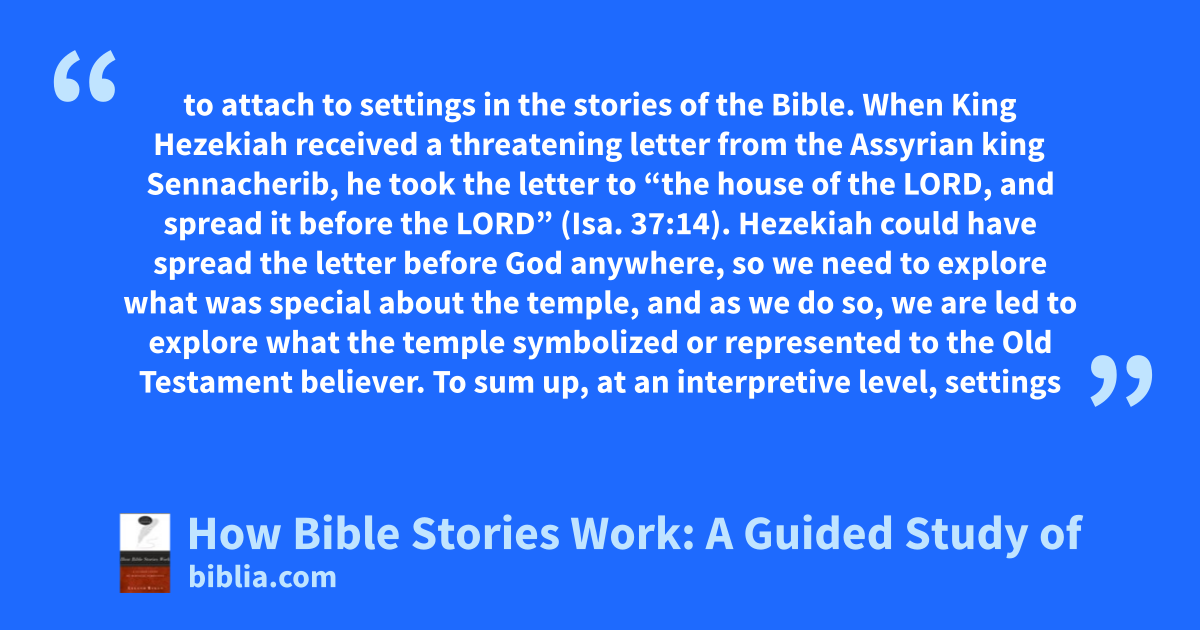 to attach to settings in the stories of the Bible. When King Hezekiah received a threatening letter from the Assyrian king Sennacherib, he took the letter to “the house of the LORD, and spread it before the LORD” (Isa. 37:14). Hezekiah could have spread the letter before God anywhere, so we need to explore what was special about the temple, and as we do so, we are led to explore what the temple symbolized or represented to the Old Testament believer. To sum up, at an interpretive level, settings